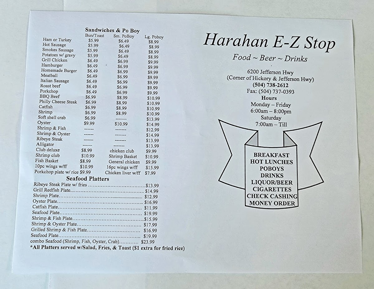 Welcome to Harahan E-Z Stop, a hidden gem in Harahan, LA, located conveniently at 6200 Jefferson Hwy. This delightful eatery offers a diverse menu that embodies the essence of comfort food, showcasing local flavors and generous portions.